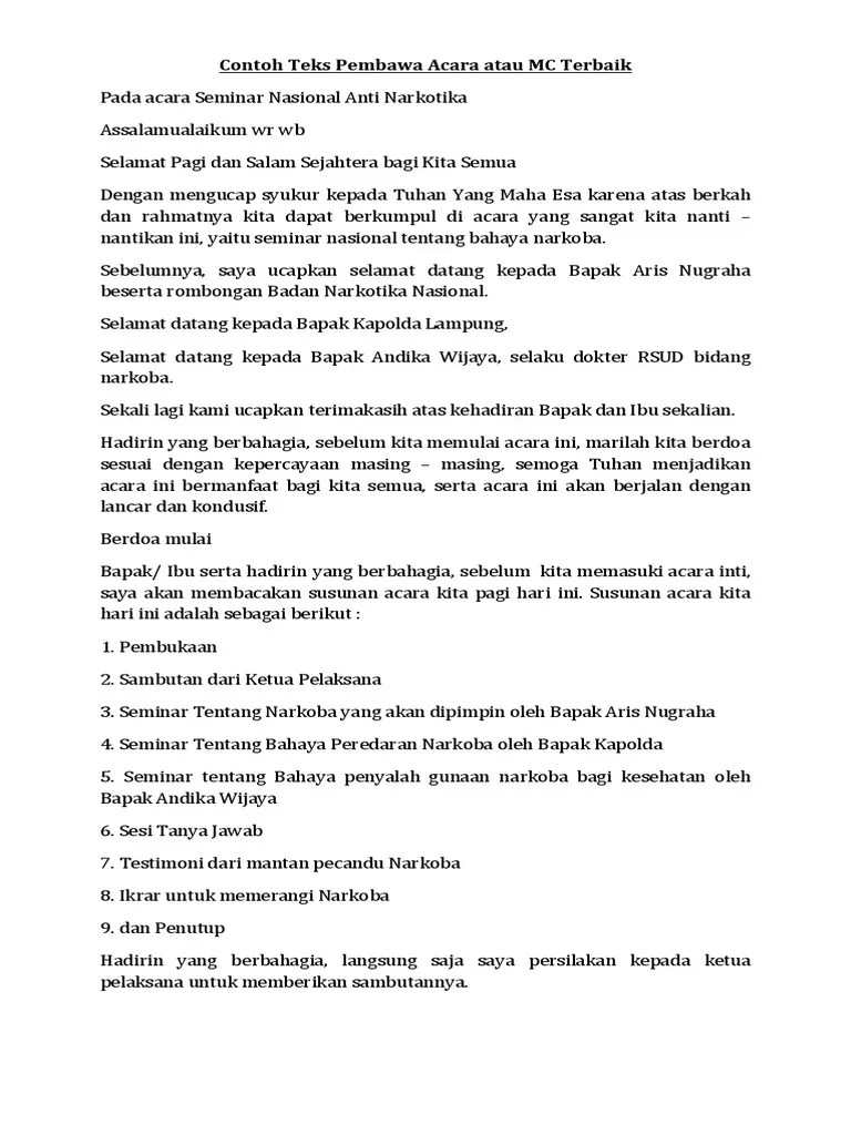 Agar acara dapat berjalan dengan lancar tentunya kita sangat membutuhkan seorang mc yang mampu membawa acara … Mc atau pembawa acara (pa) acara formal biasanya terpaku pada naskah (script) yang sudah disusun. Teks mc dan susunan acara halal bihalal untuk acara kampung, rt, rw atau dusun. Susunan acara dibuat agar acara yang telah dirancang dapat berjalan dengan teratur sesuai dengan apa yang telah direncanakan. Jeremy teti (lahir 31 maret 1968) adalah presenter, pemeran, dan komedian indonesia. Jumpa lagi dengan saya reno dan rekan saya latif dalam acara berita pagi indonesia terpopuler dan terakurat.